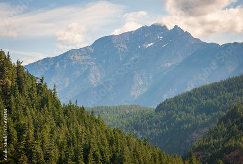Fototapeta premium View of the Snow Covered Mountain Peaks and Forest at North Cascades National...