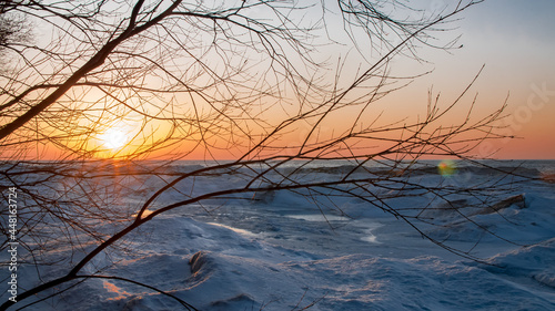 © Karori Production, Fototapeta premium View of the sunset on a frozen lake covered by the thick ice in Ontario, Canada.