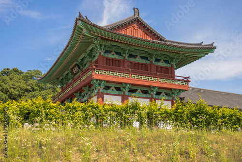 © Elena, Obraz premium View of the surrounding area and entrance to the ancient Wolcheongyo Bridge built during the Silla Dynasty (676-935). Gyeongju, South Korea