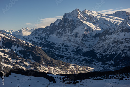 Fototapeta premium View of the Swiss mountains in winter. Mittelhornin clouds, Schreckhorn and Wetterhorn. Swiss alps in Switzerland Jungfrauregion