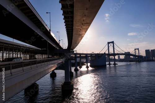 Obraz premium View of the Tokyo Bay during the day from the Rainbow Bridge in Odaiba. Busy...