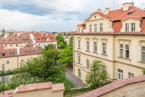 © karamysh, Obraz premium View of the top of old buildings with red roof and dramatic sky at Prague city Czech republic.