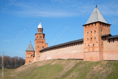 Fototapeta premium View of the towers of the Kremlin in Veliky Novgorod, sunny april day. Russia
