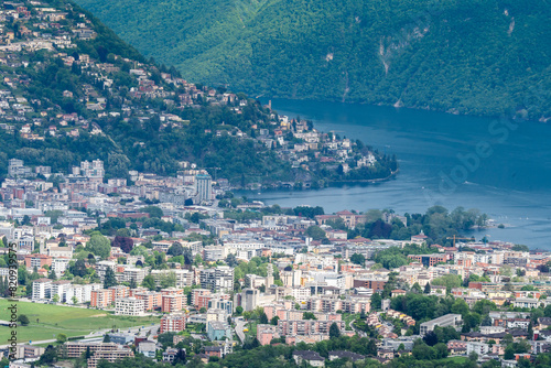 Fototapeta premium view of the town of Lugano in Italy. charming town, lush green hills, serene...