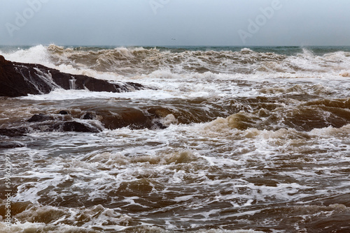 Fototapeta premium View of the volcanic shore of the stormy Atlantic Ocean in the area of...