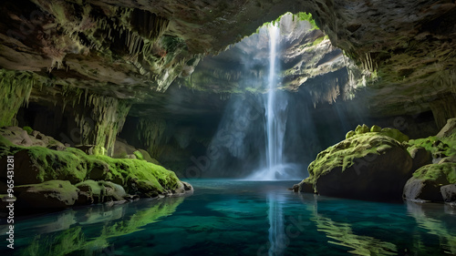 © Unique GD, Fototapeta premium View of the waterfall from the cave, Spectacular stalactites and stalagmites formed by water and mineral deposits decorate the caves.