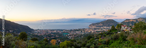 Obraz premium View of Touristic Town, Sorrento, Italy. Coast of Tyrrhenian Sea. Cloudy Sky Sunset. Panorama