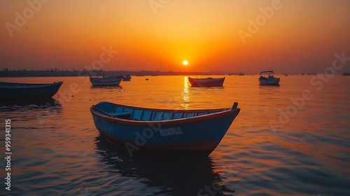 © Generative AI, Fototapeta premium View of tranquil sunset with boats on ocean at paradise point karachi pakistan : Generative AI