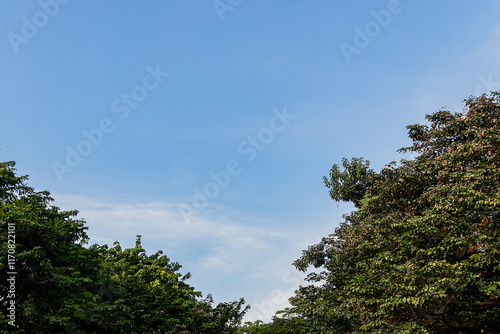 © Chalearmrat, Obraz premium View of treetops and the sky, perfect for a background.