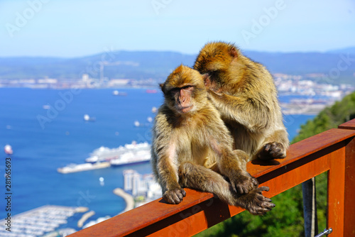 © eqroy, Naklejka premium View of two wild Barbary Macaque monkeys grooming each other at the top of the Rock of Gibraltar