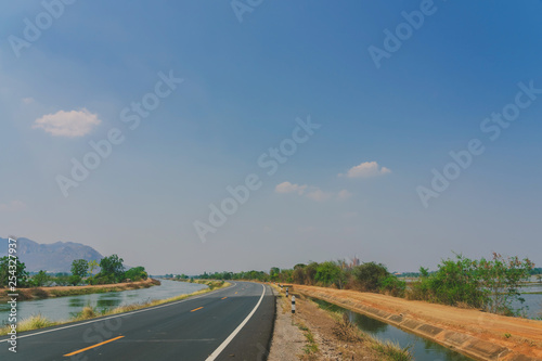 © JinnaritT, Fototapeta premium View of Water management in the rice fields from the irrigation canal before planting in Kanchanaburi, Thailand.