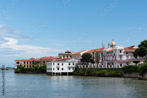 Fototapeta premium View of waterfront and buildings in Casco Antiguo (Spanish old town), also known as Casco Viejo of Panama City in Panama. Vacation concept. Gulf of Panama.