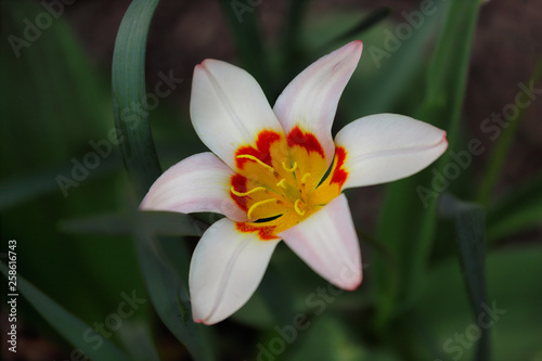 Fototapeta premium View of white-yellow-orange tulip flower in the spring garden