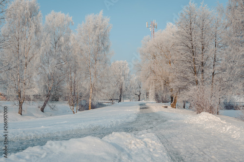 Naklejka premium View of winter park with magnificent hoarfrost and cleared walking lanes. Latvia. Baltic.