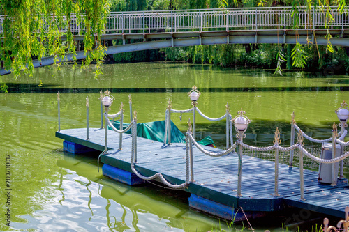 © elenakirey, Fototapeta premium View of wooden pier, decorated with lights and rope, in calm green lake water with bridge on background