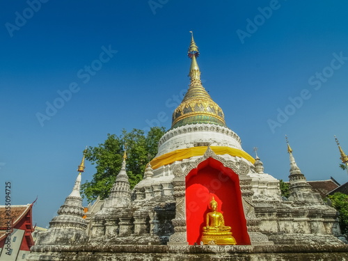 © Yuttana Joe, Fototapeta premium view of yellow Seated Buddha in arch flame with white pagoda lanna style art and blue sky background, Wat Buppharam in Chiang Mai City, northern of Thailand.