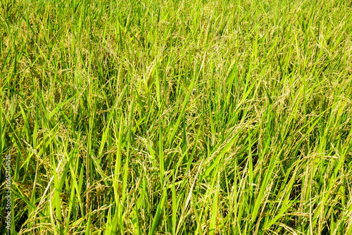 © Juntee, Obraz premium View of young rice fields, bright green, blurred nature background.