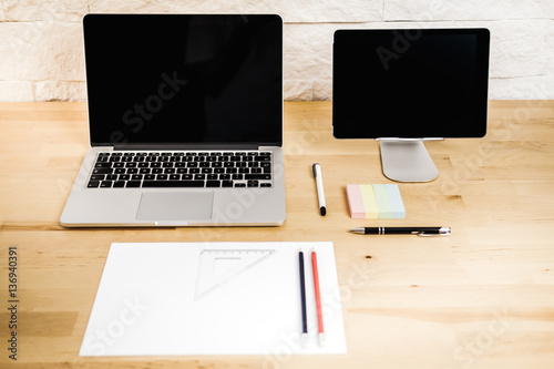 Fototapeta premium view on a wooden desk with a computer tablet and paper
