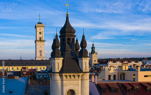 Fototapeta premium View on Armenian Cathedral of the Assumption of Mary from drone in Lviv,...