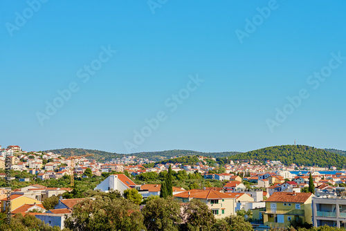 © Lazy_Bear, Obraz premium View on coastal town with red roofed houses and lush green hills under clear blue sky. Touristic Mediterranean town near Adriatic sea for summer holidays