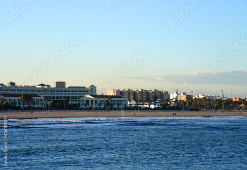 © MaxSafaniuk, Fototapeta premium View on coastline and beach from La Marina de Valencia on the sea to the Las Arenas beach, Playa de las Arenas, Platja del Cabanyal and Playa de la Malvarrosa. Waves at sea on sunset.