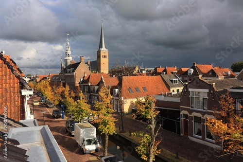 Fototapeta premium View on Franeker The Netherlands from Noord with Martinikerk and old city hall against a stormy sky in autumn