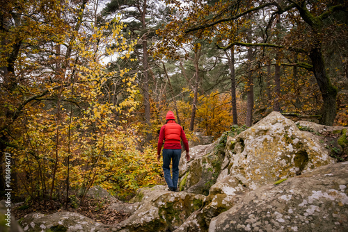 © AUFORT Jérome, Fototapeta premium View on hiker in forest in autumn