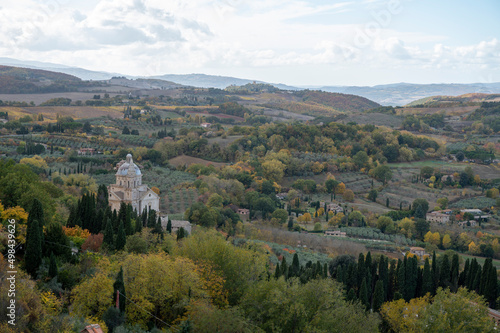 Naklejka premium View on hills and vineyards near old town Montepulciano, Tuscany, Italy