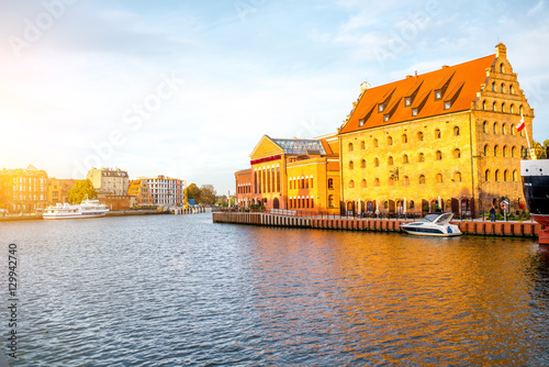 Obraz premium View on Motlawa river and riverside on the sunset in Gdansk, Poland
