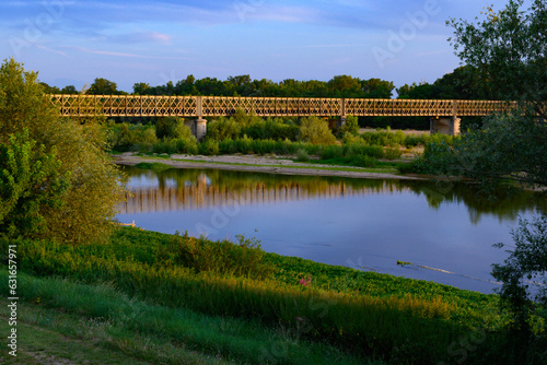 © barmalini, Fototapeta premium View on Pont de Pouilly-sur-Loire bridge 496 km from the source and 496 km from the mouth of the Loire river near Pouilly-sur-loire, Central France ar sunset