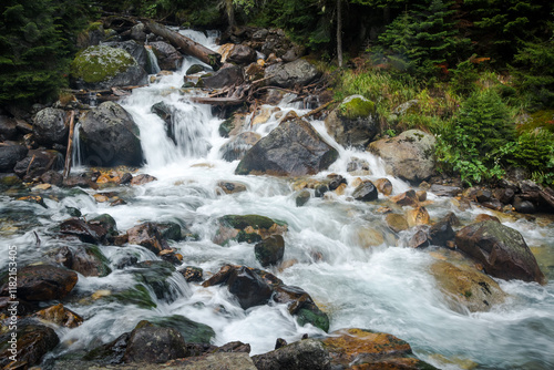 Fototapeta premium View on rapid mountain river, Caucasus, Dombai, Russia