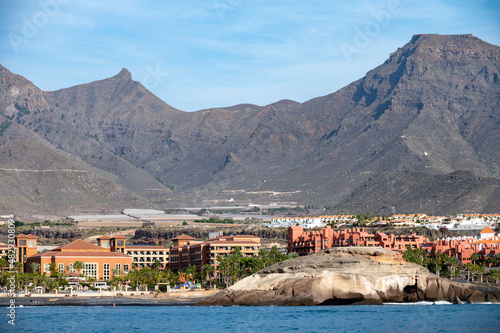 Obraz premium View on resorts and beaches of South coast of Tenerife island during sail...