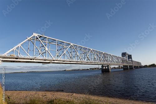 © vesta48, Obraz premium View on Severodvinsk Bridge is a road, railway and pedestrian bridge in the city of Arkhangelsk across the Severnaya Dvina River. Russia