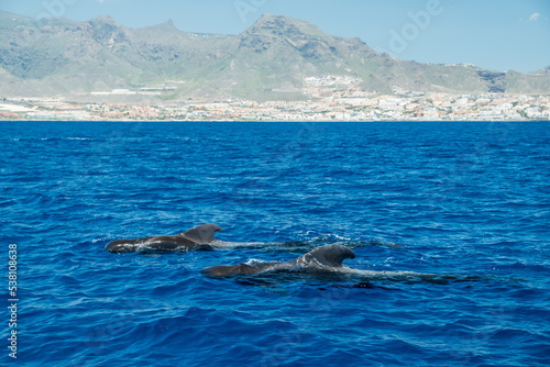 © volff, Naklejka premium View on Tenerife island from ocean. Pilot whales in the water are in the foreground.