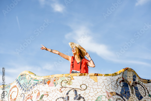 Obraz premium View on the beautiful terrace decorated with mosaic with happy woman tourist in Guell park in Barcelona