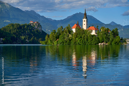 Fototapeta premium View on the island with the Church of the Assumption on Bled lake, Slovenia