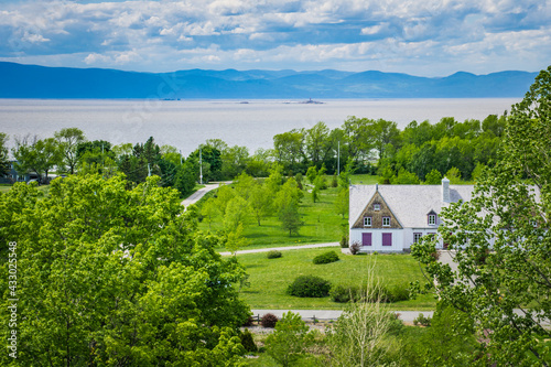 © Pernelle Voyage, Obraz premium View on the Musée de la Mémoire Vivante historic building and the St Lawrence River from the innovation tower, an observation tower in St Jean Port Joli in Quebec (Canada)