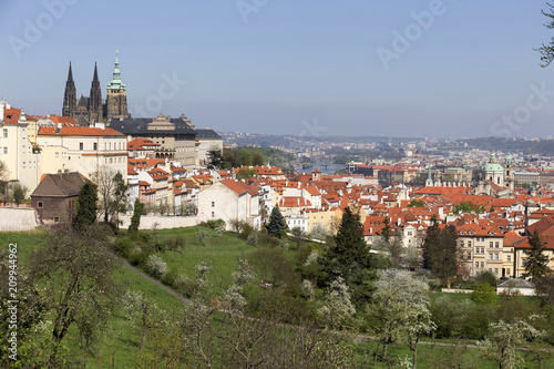 Fototapeta premium View on the spring Prague City with the green Nature and flowering Trees,...