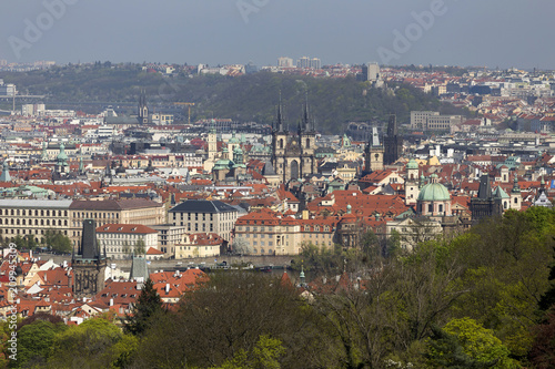 © Kajano, Obraz premium View on the spring Prague City with the green Nature and flowering Trees, Czech Republic