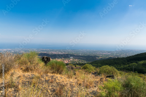 © Iryna Boro, Obraz premium View on the village Taormina. Houses in the small village near volcano. Ground, plants, grass. Sicily, Italy.