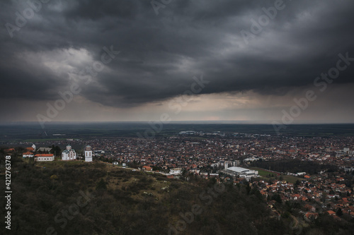 © Branimir, Obraz premium View on the Vršac city under the rainy clouds