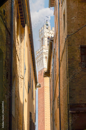 Fototapeta premium View on Torre del Mangia on Piazza del Campo from the narrow streets in the...