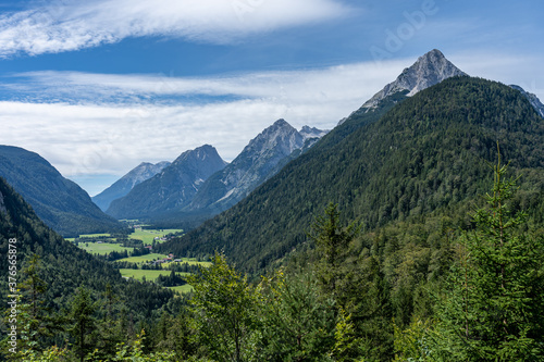 © Alexander, Fototapeta premium view on wetterstein mountains and leutasch valley from ederkanzel guest court restaurant in summer