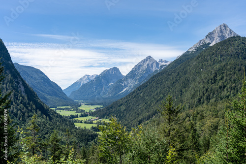 © Alexander, Fototapeta premium view on wetterstein mountains and leutasch valley from ederkanzel guest court restaurant in summer