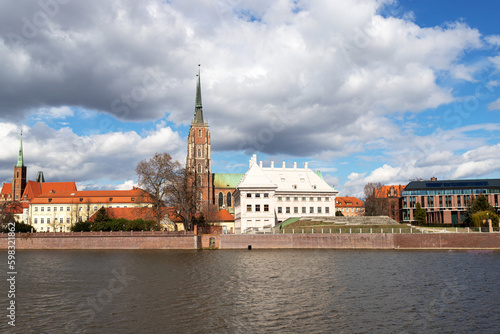 Fototapeta premium View on Wroclaw Old Town. Island and Cathedral of St John on river Odra. Wroclaw.