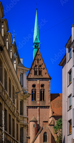 Fototapeta premium View onto the facade and tall spire of the Saint Pierre le Jeune Protestant church on Grande Ile, historic center of Strasbourg, Alsace, France