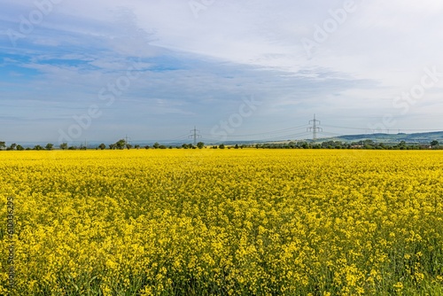 Fototapeta premium View over a blooming rapeseed field day in spring
