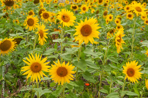 Fototapeta premium view over agricultural field with yellow sunflowers