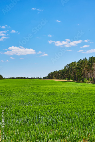 © Mickis Fotowelt, Fototapeta premium View over fields to a forest edge under a blue sky with white clouds.
