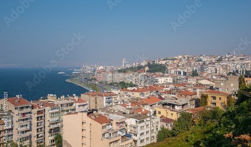 © mitzo_bs, Fototapeta premium View over Konak district of Izmir, Turkey, with residential buildings. Gulf of Izmir on the Aegean Sea and the seaport terminal.